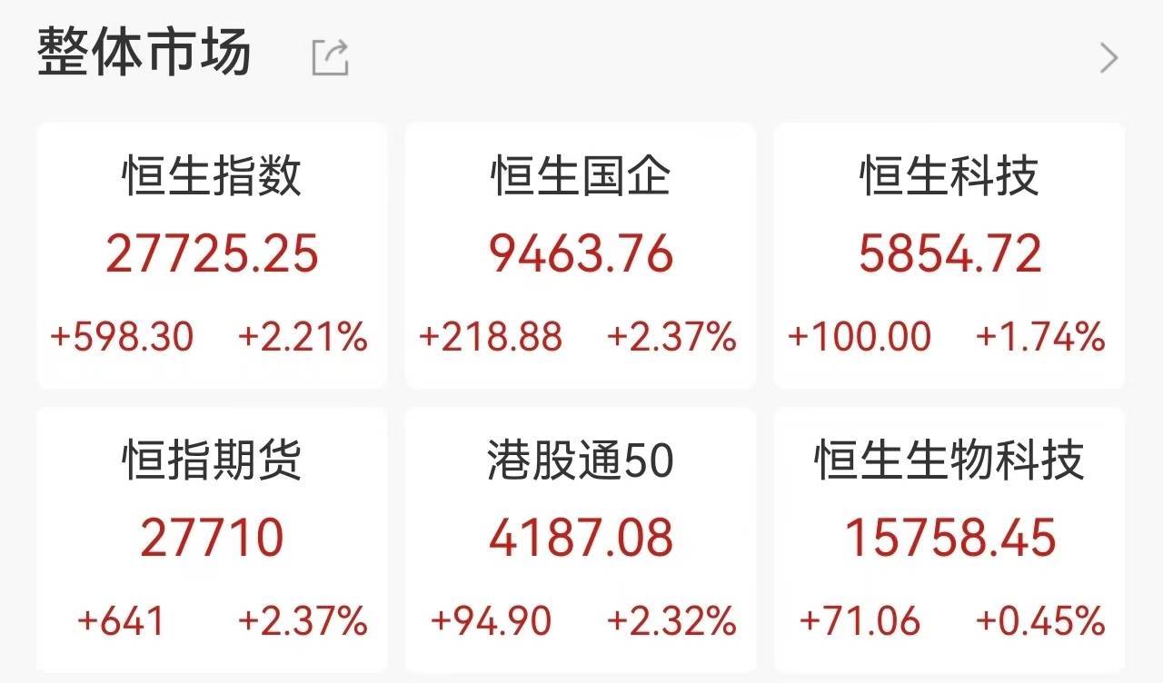 港股上午盘三大指数高开高走,大金融股、科技股、中字头股等权重集体拉升助力大市上扬赢翻网,截止午盘,恒生指数涨2.21%报27725点,创下2021年8月以来新高,国企指数涨2.37%,恒生科技指数涨1.74%,市场做多情绪积极。